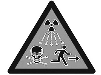 新標(biāo)志為黑框紅底三角,內(nèi)有一個(gè)輻射波標(biāo)記、一個(gè)骷髏頭標(biāo)記和一個(gè)逃跑的人形。