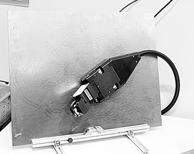 在展臺(tái)上,記者看到一個(gè)像壁虎一樣吸附在鐵板上爬行的機(jī)器,不禁問(wèn)道:它能干什么?