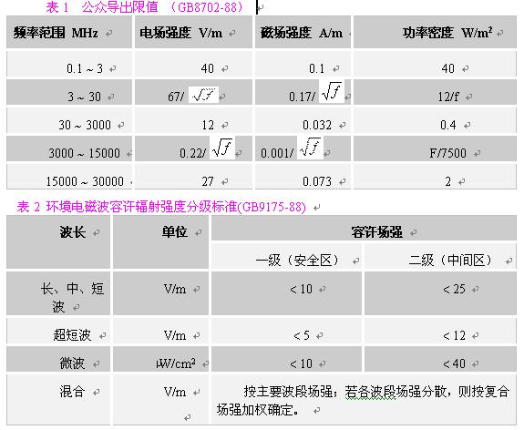 在對(duì)一般環(huán)境的電磁輻射分析中,應(yīng)主要選用《環(huán)境電磁波衛(wèi)生標(biāo)準(zhǔn)》主要選用《環(huán)境電磁波衛(wèi)生標(biāo)準(zhǔn)》(GB9175-88),根據(jù)輻射源的主要輻射頻率,參照表2,找到其輻射強(qiáng)度限值。注意掌握三個(gè)標(biāo)準(zhǔn)限值,一般我們把居民居住的環(huán)境按一級(jí)安全區(qū)處理,則其標(biāo)準(zhǔn)限值為:在長(zhǎng)、中、短波,電場(chǎng)強(qiáng)度應(yīng)小于10V/m;在超短波段,電場(chǎng)強(qiáng)度應(yīng)小于5V/m;在微波波段,其輻射功率密度應(yīng)小于10μW/cm2。考慮到對(duì)在電磁輻射環(huán)境內(nèi)工作人員的保護(hù),我們建議在職業(yè)安全衛(wèi)生領(lǐng)域,采用《電磁輻射防護(hù)規(guī)定》(GB8702-88)的相應(yīng)限值。